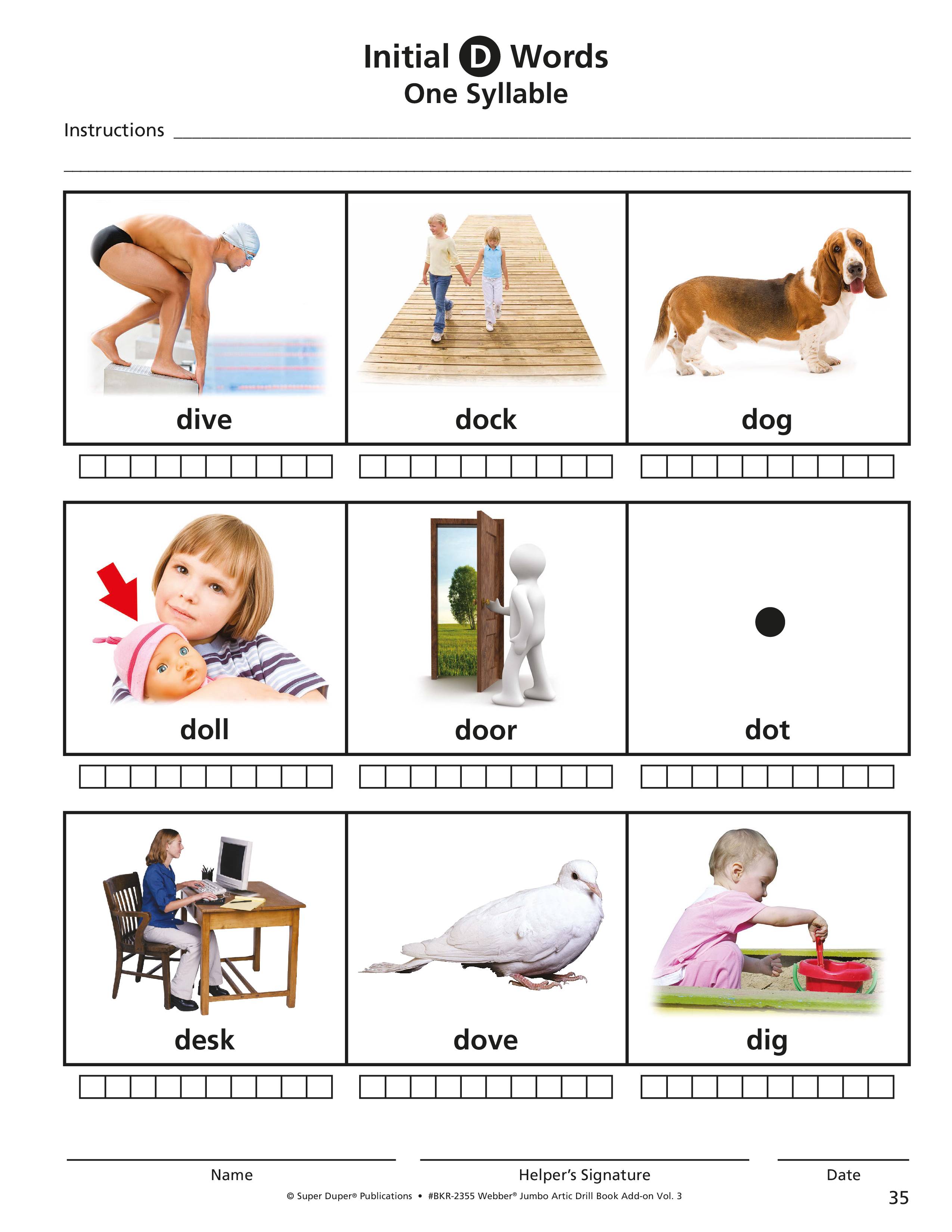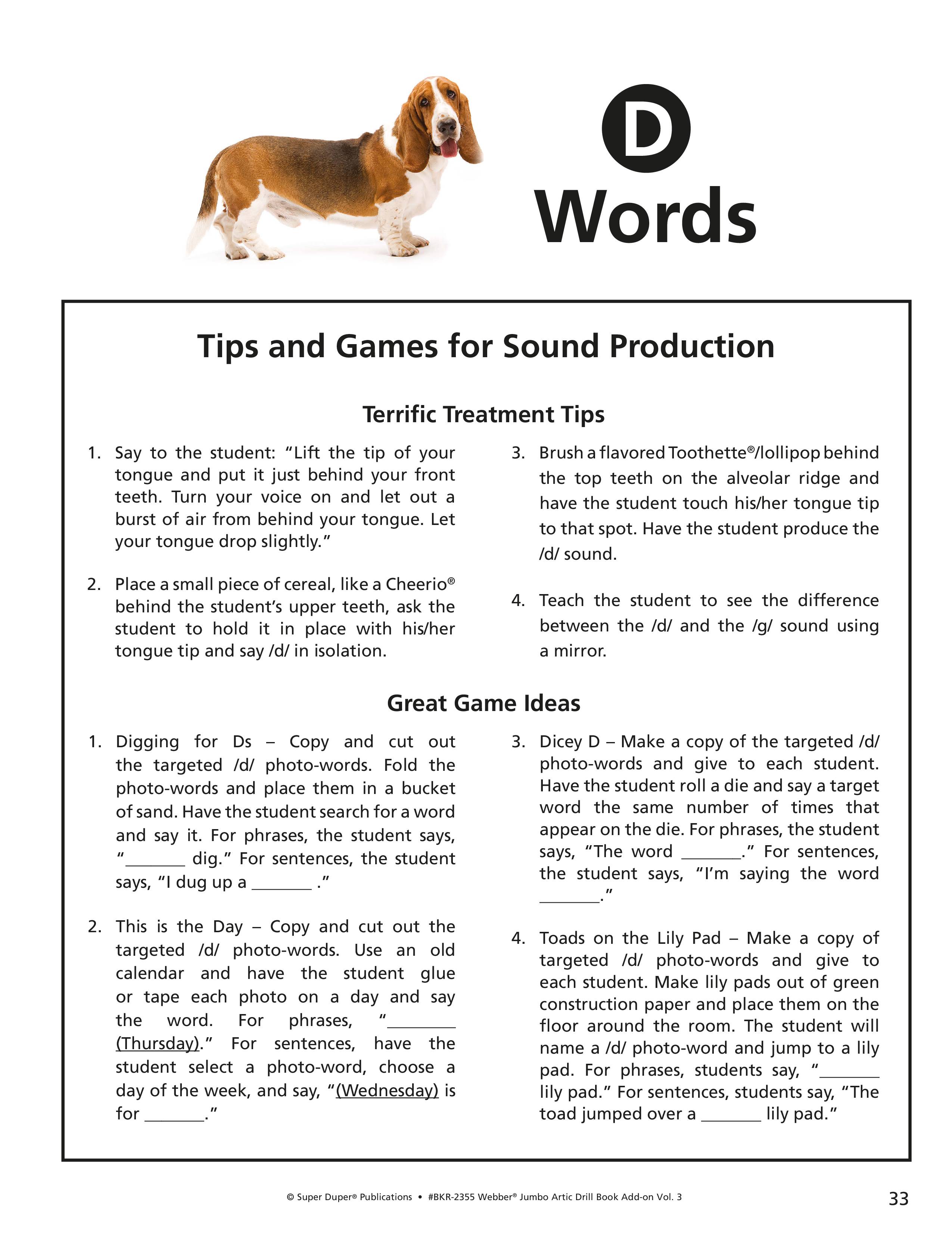 Description: Includes D, N, and T in one, two, and three+ syllable words in all positions and words with recurring target sounds. This resource includes the D, N, and T sections of the Webber Jumbo Artic Drill Book, Vol. 3.