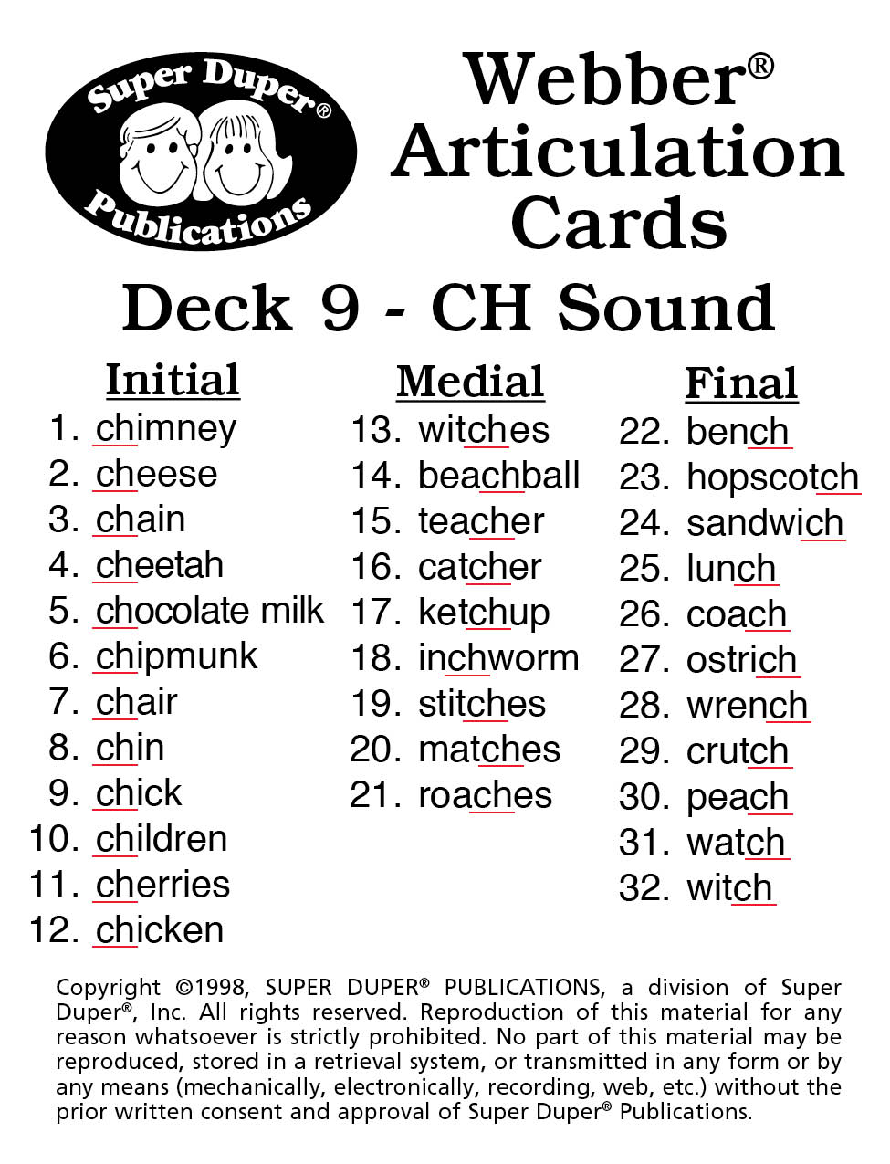 Description: 32 pairs (64 total) of illustrated cards for CH sound in initial, medial, and final positions of words for use in a variety of activities.