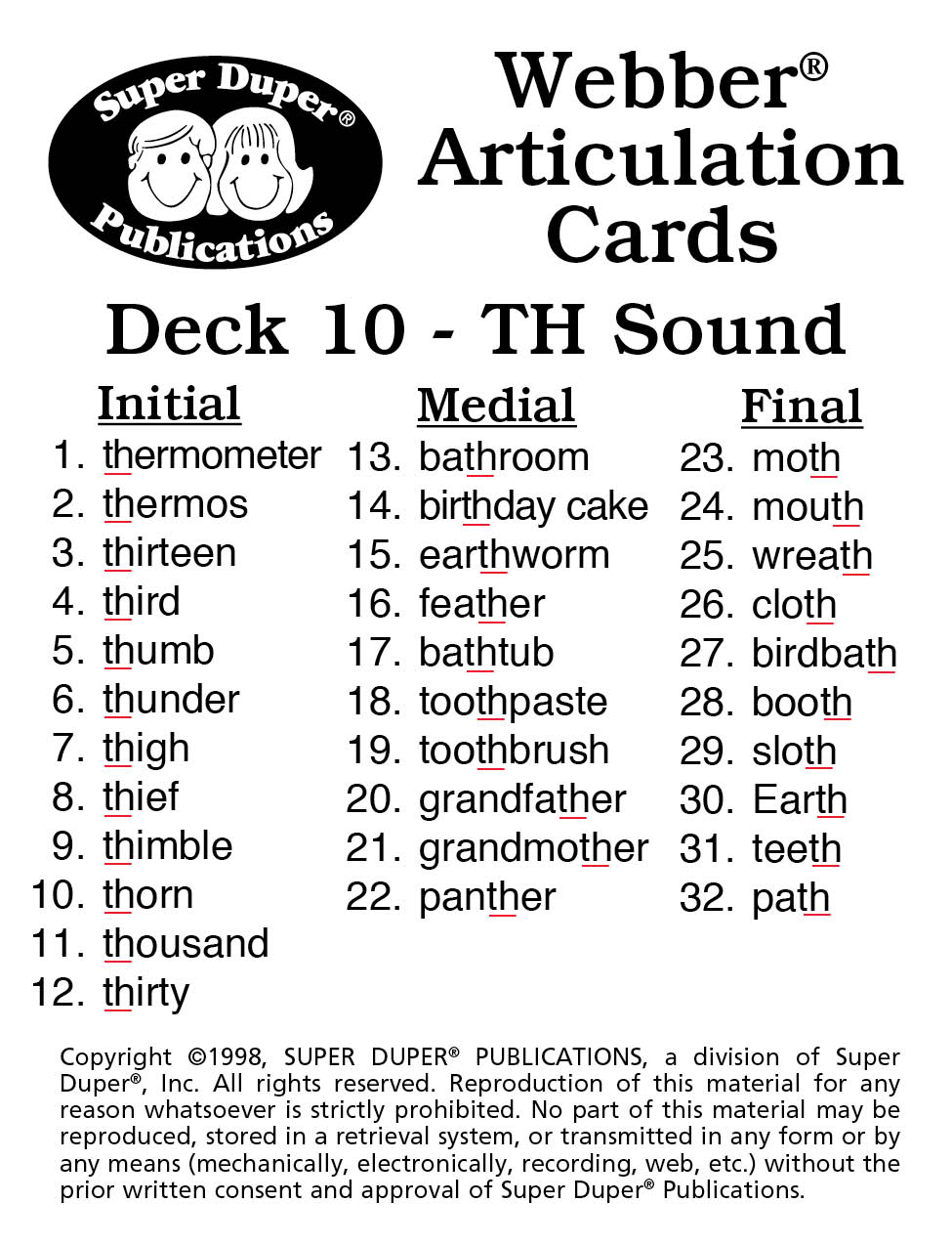 Description: 32 pairs (64 total) of illustrated cards for TH sound in initial, medial, and final positions of words for use in a variety of activities.