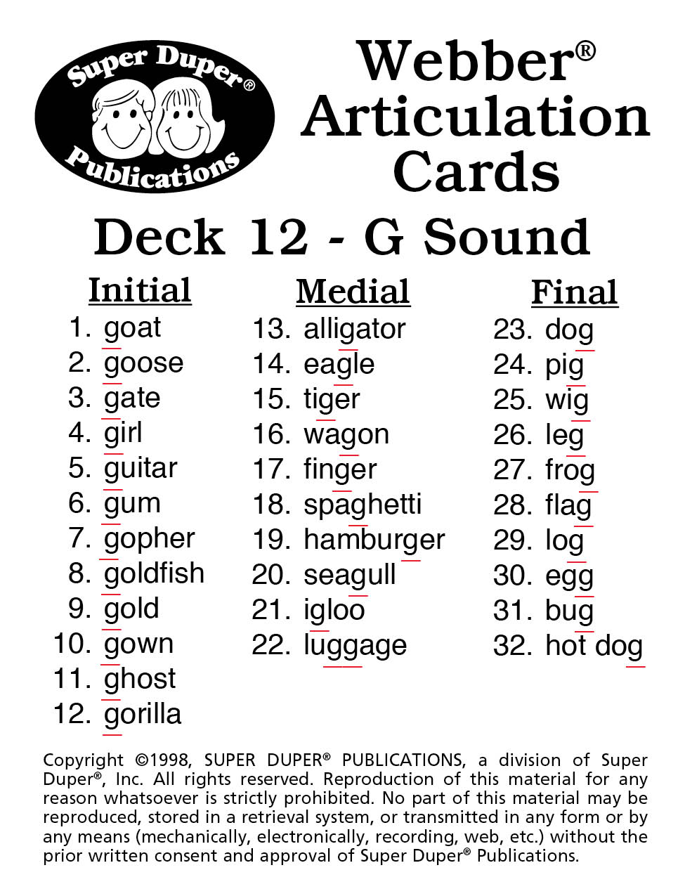 Description: 32 pairs (64 total) of illustrated cards for G sound in initial, medial, and final positions of words for use in a variety of activities.