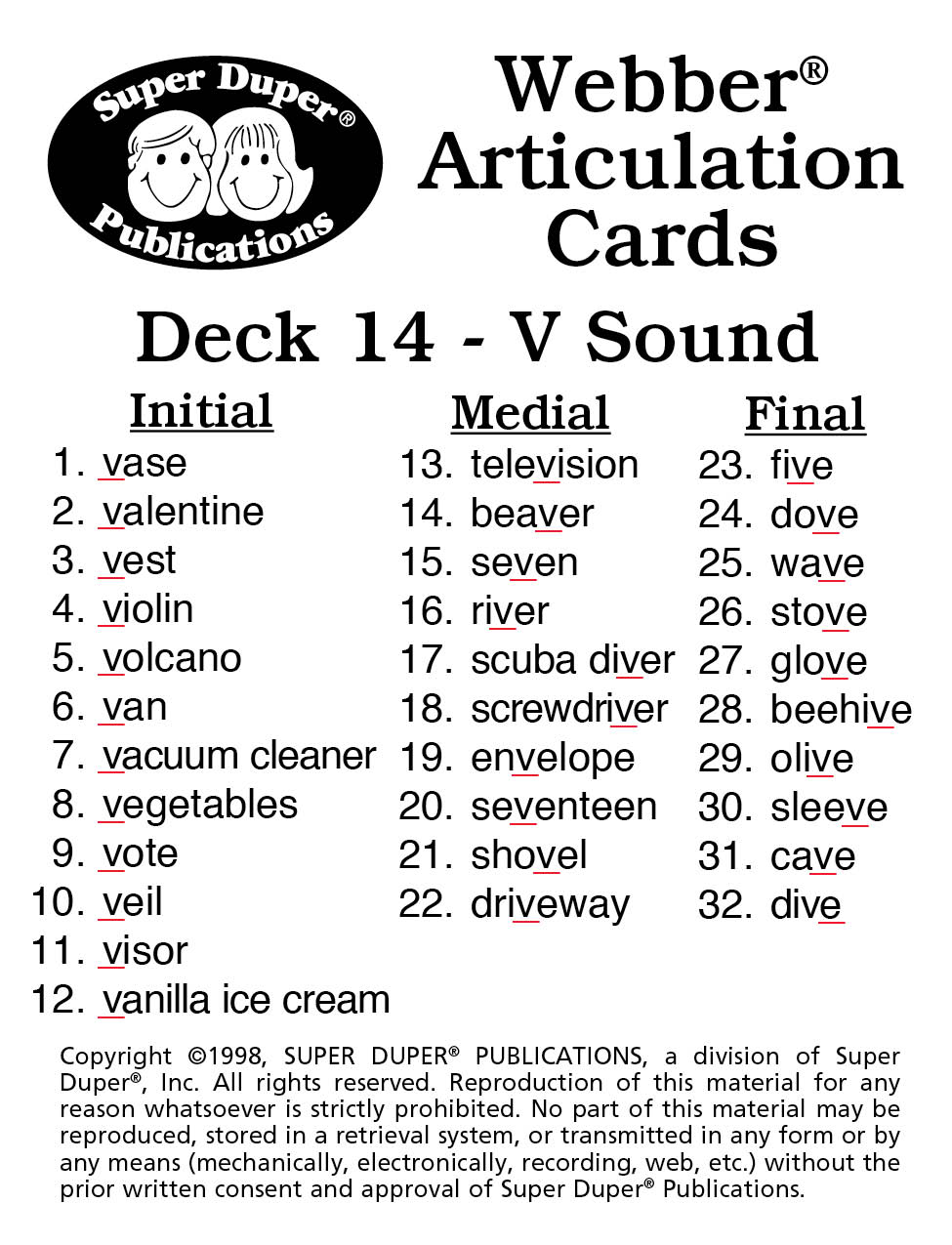 Description: 32 pairs (64 total) of illustrated cards for V sound in initial, medial, and final positions of words for use in a variety of activities.