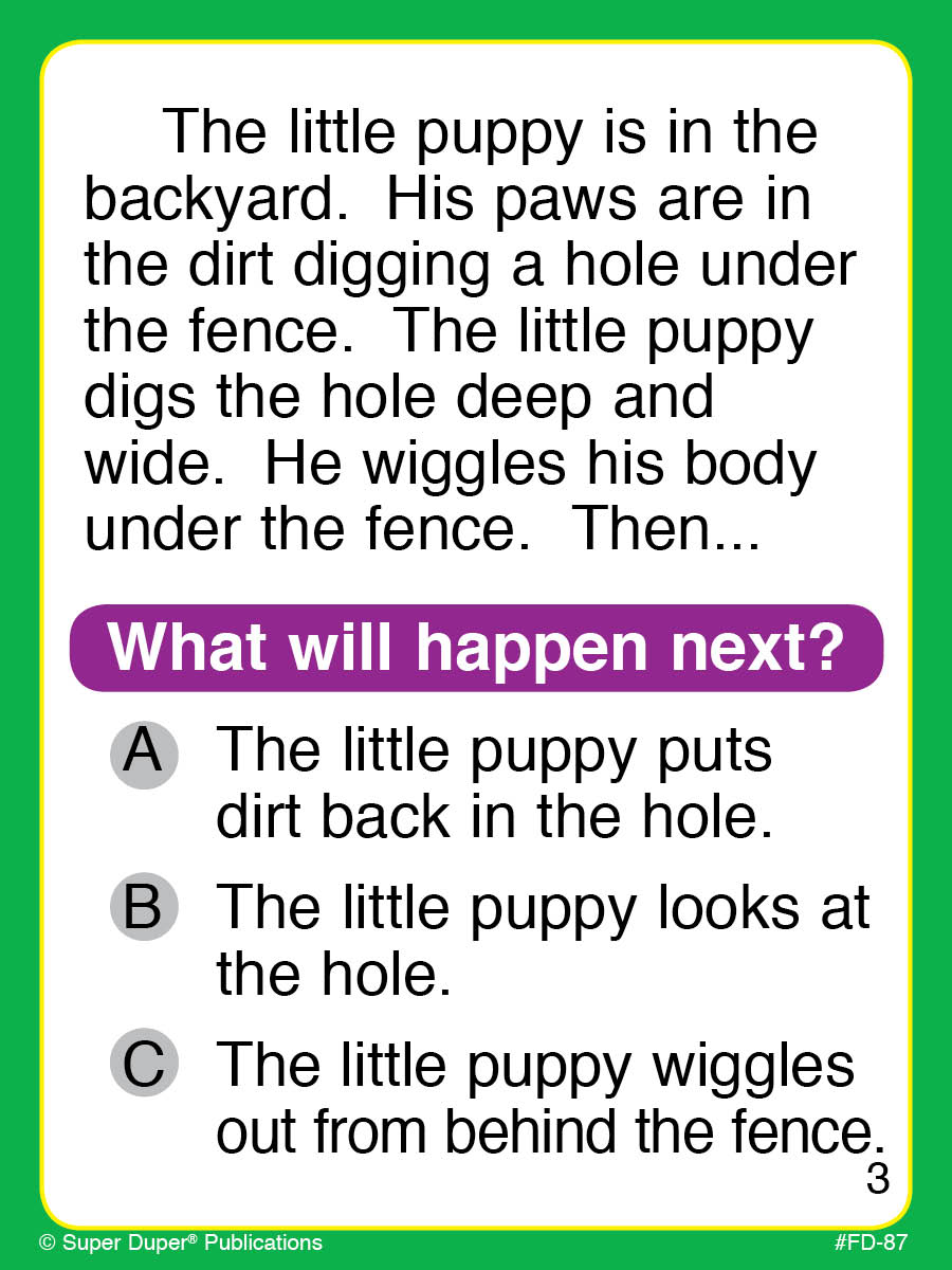 Description: 56 short-story cards help improve students' ability to predict by choosing what will happen next in each story.